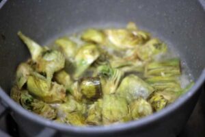 - Cocinar las alcachofas. Llegó la hora de cocinar las alcachofas directamente sobre la sartén con aceite. Primero las sellarás durante un par de minutos por lado, cuidando de haber colocado la cantidad justa de aceite sin excederte. Al terminar de sofreír las tendrás que conservarlas a un lado sin calor para los siguientes pasos.