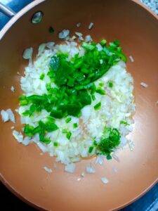 - Pochamos la cebolla. Picamos muy finita la cebolla y los dientes de ajo y los ponemos a sofreír en una