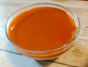 - A continuación el fumet de langostinos.... Es el turno del fumet de langostinos que previamente habíamos hecho o ya lo teníamos guardado. En caso de no tenerlo podemos hacerlo con cualquier caldo de pescado concentrado o mismamente con agua. Lo añadimos a la