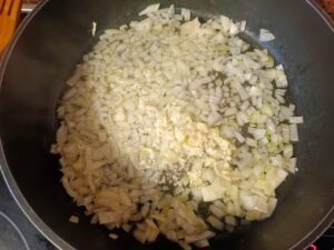 - Sofreímos la cebolla y los dientes de ajo. Picamos muy fina la cebolla y la ponemos a sofreír en una