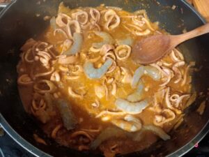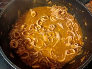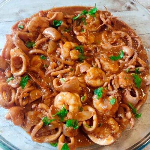 - Ya al final,... los langostinos. Ya cuando veamos que los calamares ya están casi en su punto le añadimos los langostinos pelados. Se echan casi al final porque se hacen en un par de minutos, así que cuando casi esté listo, lo dejamos que se hagan con la salsa unos 2 minutos y despues apagamos el fuego y dejamos que se vaya haciendo con el calor residual. Con esto tendremos la receta lista!!!