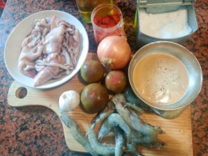 - Preparamos los ingredientes. En primer lugar tenemos que preparar los ingredientes para disponer de ellos a medida que los vamos necesitando. También ésta receta tiene el handicap de que vamos a utilizar fumet de langostinos casero y antes de comenzar, tenemos que limpiar bien los calamares sino lo hizo nuestro pescasdero de confianza.