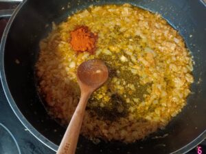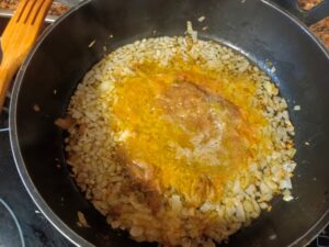 - Turno de las especias. Sin subir el fuego, le echamos sal al gusto y una cucharadita de pimentón dulce. Lo