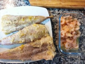 - Añadimos las gambas y el rape. Una vez evaporado el alcohol, bajamos el fuego a fuego medio (Al 6 de 9 en mi