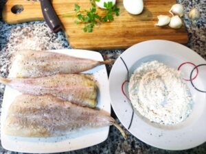 - Preparamos las colas de rape. Para prepararlas lo que vamos a hacer es salpimentarlas por las dos caras y después las pasamos por harina por ambas caras también.