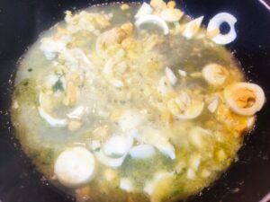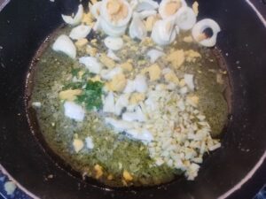 - Comenzamos el sofrito. Aprovechando el aceite de rehogar las gambas y las colas de rape, ponemos a sofreír los ajos, el perejil y los huevos cocidos. Lo dejamos a fuego medio (Al 6 de 9 en mi