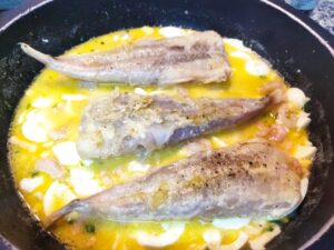 Cazuela de Hierro y dejamos que se vaya haciendo las colas de rape durante 5 minutos. En ese momento, destapamos y les damos la vuelta a las colas de rape y lo dejamos otros 5 minutos.** El pescado se hace bastante rápido, hay que ir mirando que no se queden sin salsa y que esté bien hecho.