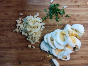 - Picamos los ajos, huevos y perejil. Con la ayuda de un buen