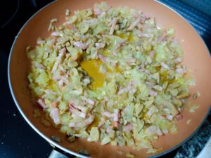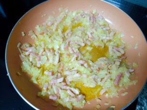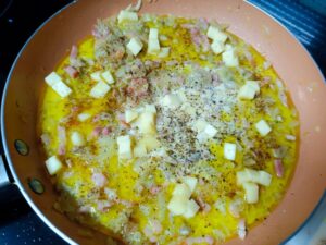- Momento de añadir el Bacón. Una vez que está sofrita la cebolla y el ajo, le añadimos el bacón que ya viene cortado en cuadraditos y lo vamos removiendo a fuego medio (Al 7 de 9 en mi
