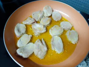 - Salpimentamos al gusto. Colocamos todas las rodajas de solomillo que hemos cortado boca abajo y con la ayuda de la mano o del cuchillo las aplastamos un poco para que vayan cogiendo la forma. A continuación, les echamos sal y pimienta negra al gusto por las dos caras.