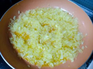 - Sofreímos la cebolla y los ajos. Picamos muy finito los dientes de ajo y la cebolla. En la