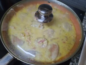 - Añadimos los Solomillos. Una vez que se ha desecho el queso le añadimos los solomillos que habíamos sellado y reservado previamente. Los echamos a la sartén con la salsa y lo dejamos con la tapa puesta a fuego medio suave (Al 5 de 9 en mi